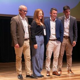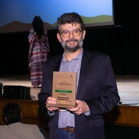 Alguns dos premiados, com seus troféus, participam de foto no palco